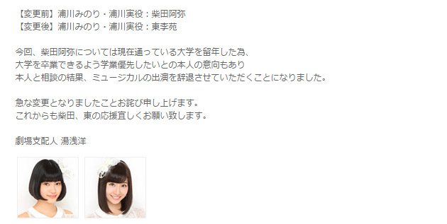 SKE48 official web site explains that Shibata Aya quits the cast because of her repeat-year in university, that is why Azuma Rion will cast Shibata Aya in the musical.