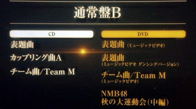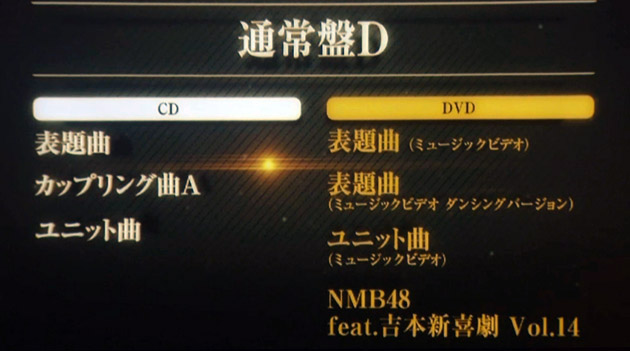 NMB48 revealed DVD details of their upcoming 14th single (TBA) on 3 March 2016, Type-A/B/C regular edition will include Autumn Sports Festival video, Type-D (regular edition) will include Yoshimoto New Comedy video, the single will be released on 27 April 2016.